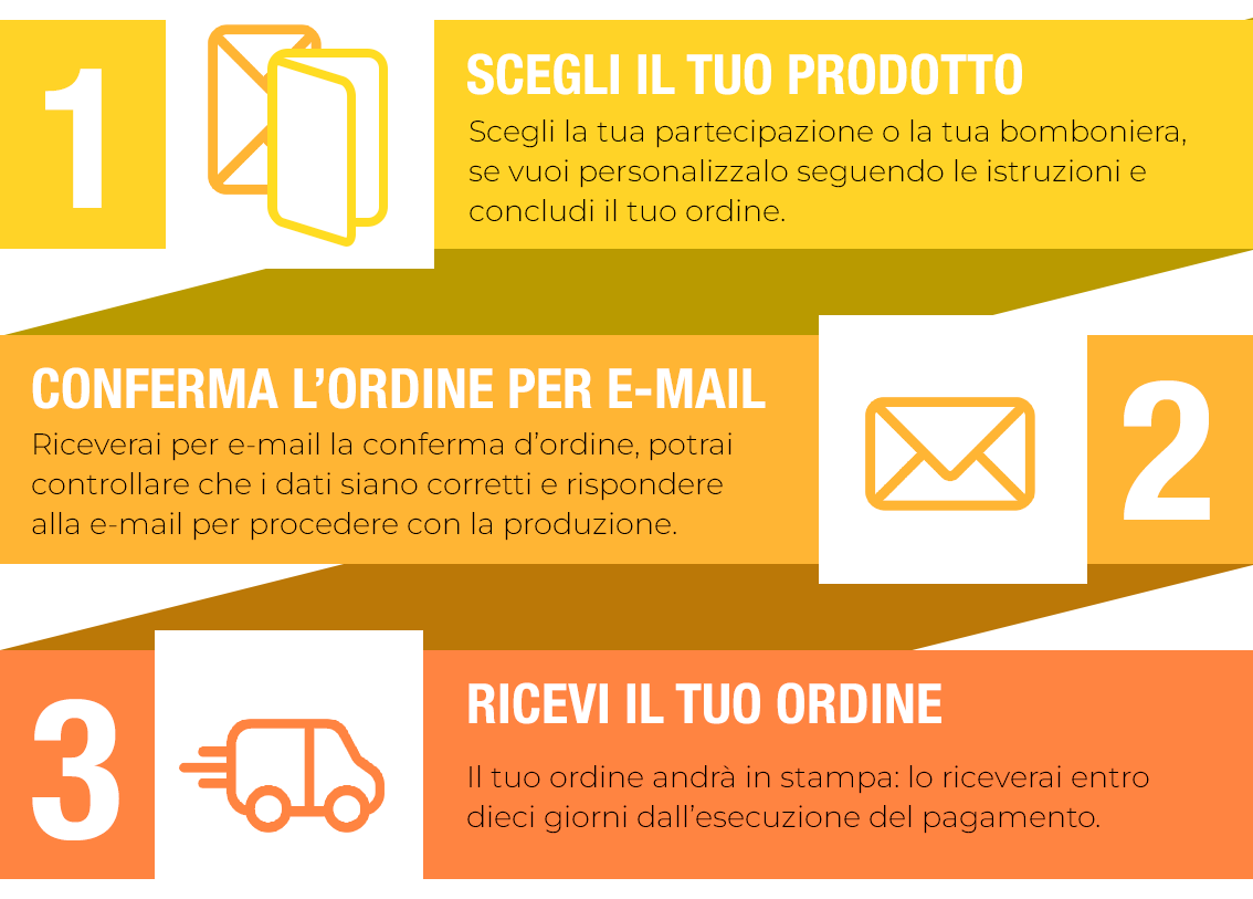 Una volta ricevuto il vostro ordine provvederemo ad inviare la conferma d’ordine con il totale. In caso di ordine con personalizzazione invieremo una bozza di stampa con i testo scelti da voi. Potrete modificare la bozza fino ad arrivare a quella definitiva con la quale andremo in stampa.
