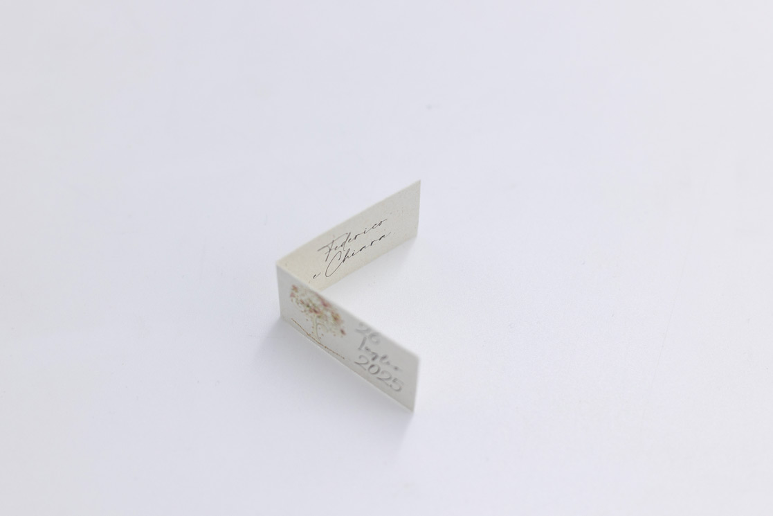 Biglietto bomboniera in carta avorio betulla con stampa a colori e decori in oro a caldo. Formato 2,5×4,5