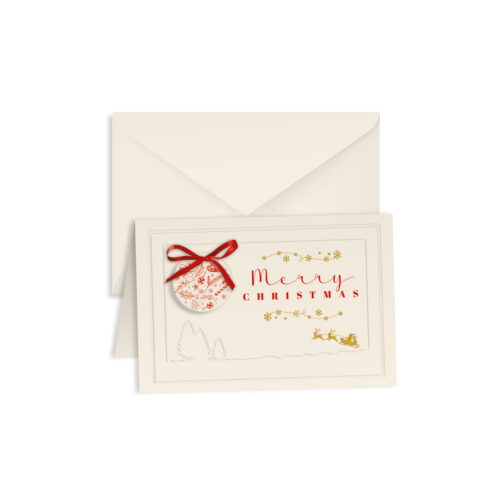 Biglietto di Natale doppio con finiture in oro, busta coordinata e tag tondo decorato con nastro rosso. Formato cm 11,7×17. Confezione da 48 unità.