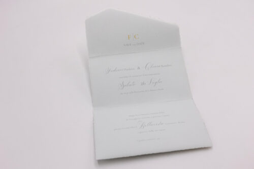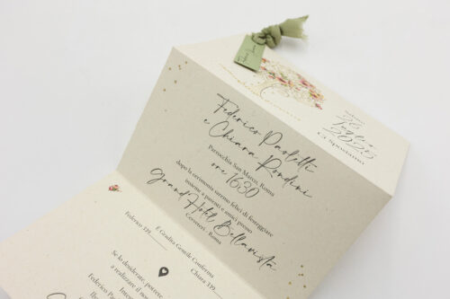 Partecipazione con esterno su carta nude (o a scelta) ed interno cartoncino betulla con stampa a 4 colori e sigillo in ceralacca