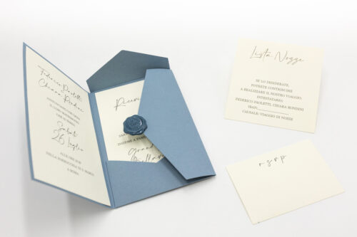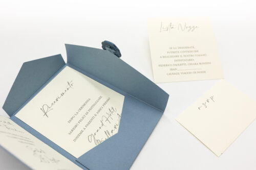 Partecipazione con esterno su carta verde salvia (o a scelta) ed interno cartoncino martellato con stampa a 4 colori e tag adesivo
