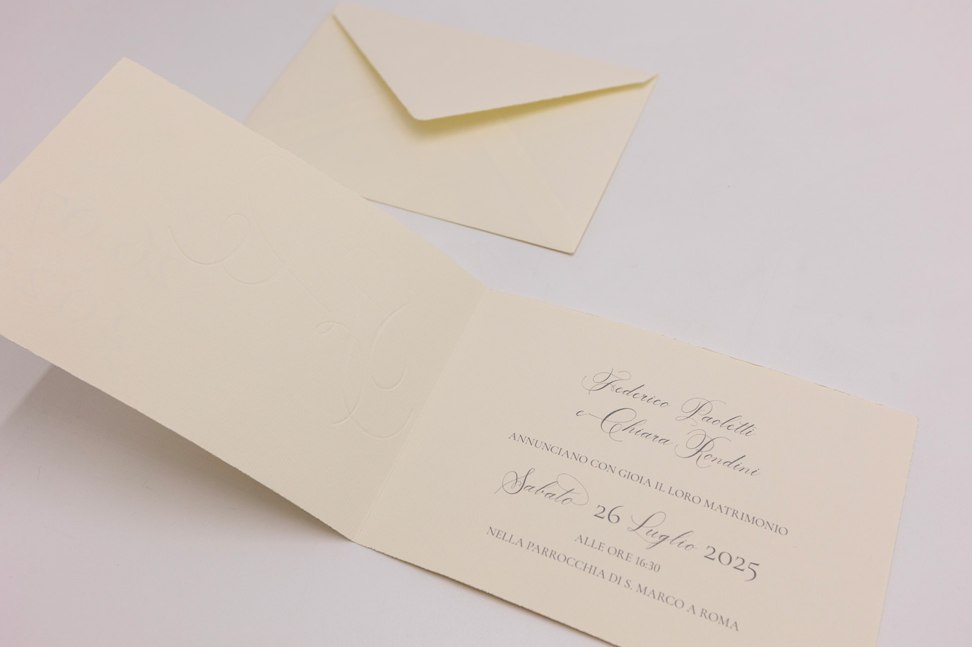 Partecipazione doppio album su cartoncinom avorio rigatoo con taglio dolce. Busta 12×18