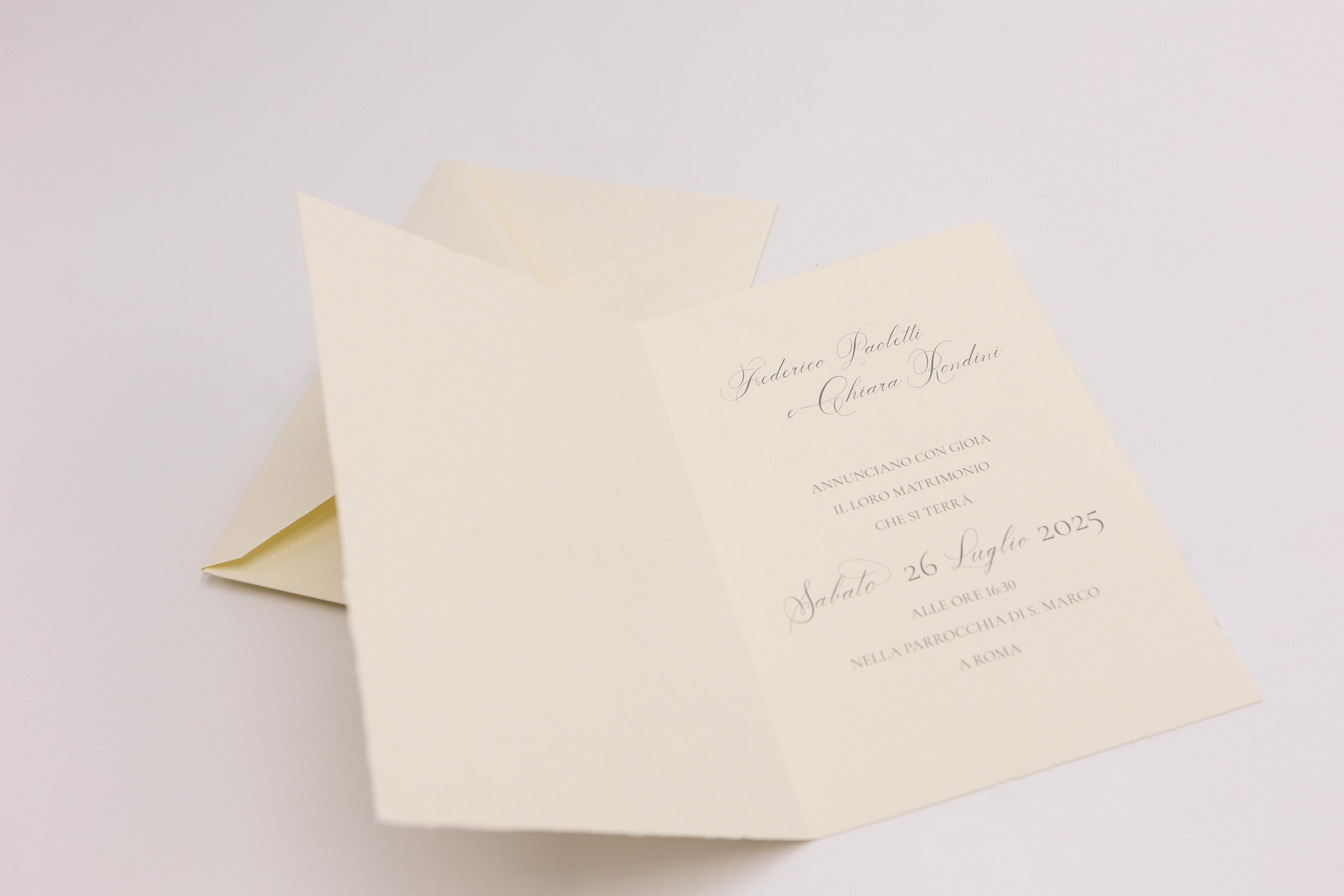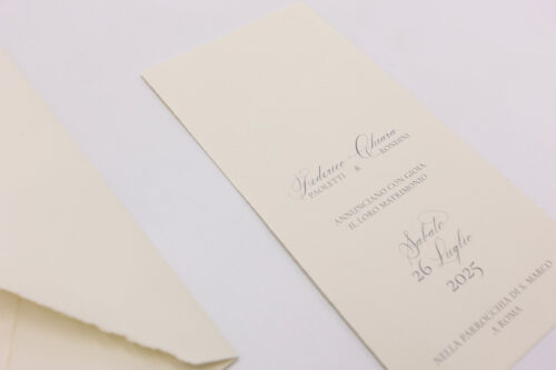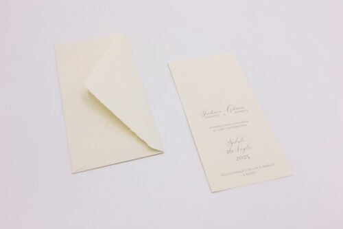 Partecipazione doppia su cartoncino avorio rigato con taglio dolce. Busta 12×18