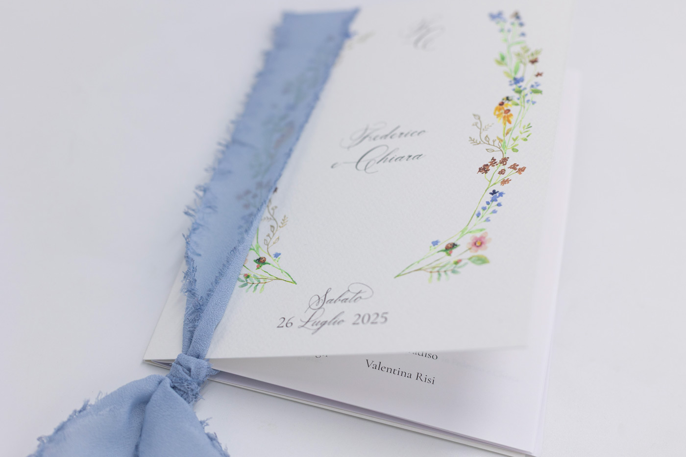 Cover su cartoncino doppio formato A5 bianco martellato con stampa a 4 colori e decori in oro. Nastro in seta color carta da zucchero. Fogli interni stampati compresi