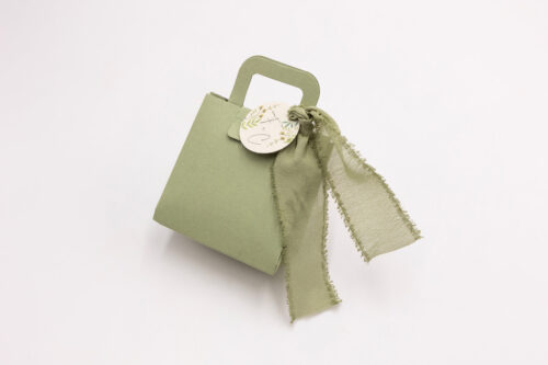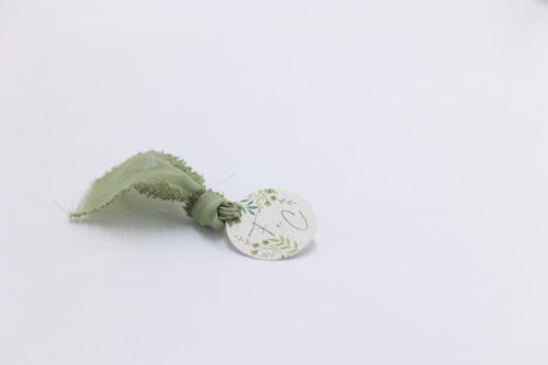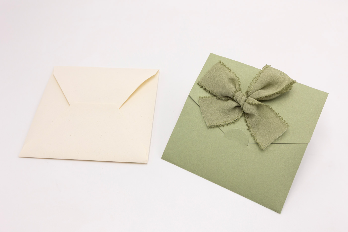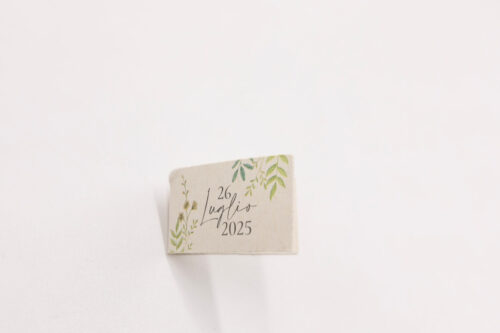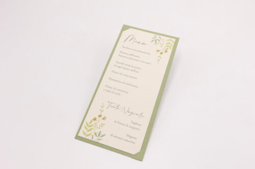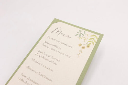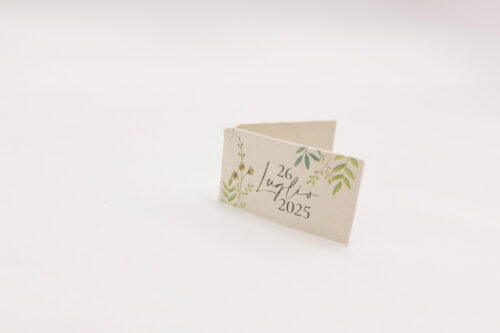 Partecipazione composta da conver con tasca in carta vede salvia e interno stampato a 4 colori su carta betulla. Inserto in carta piantabile e nastro di chiffon sfrangiato colore verde salvia