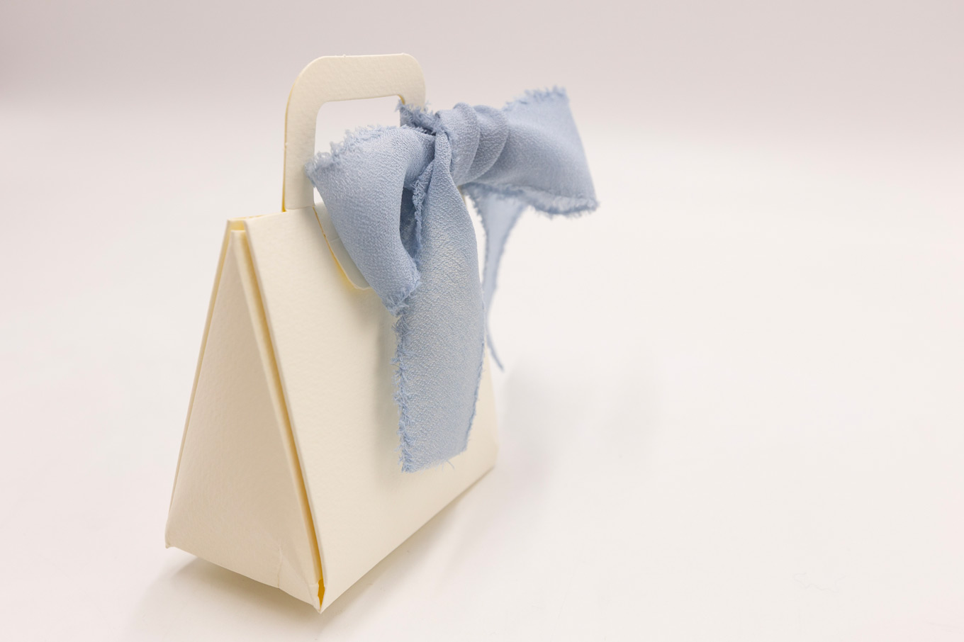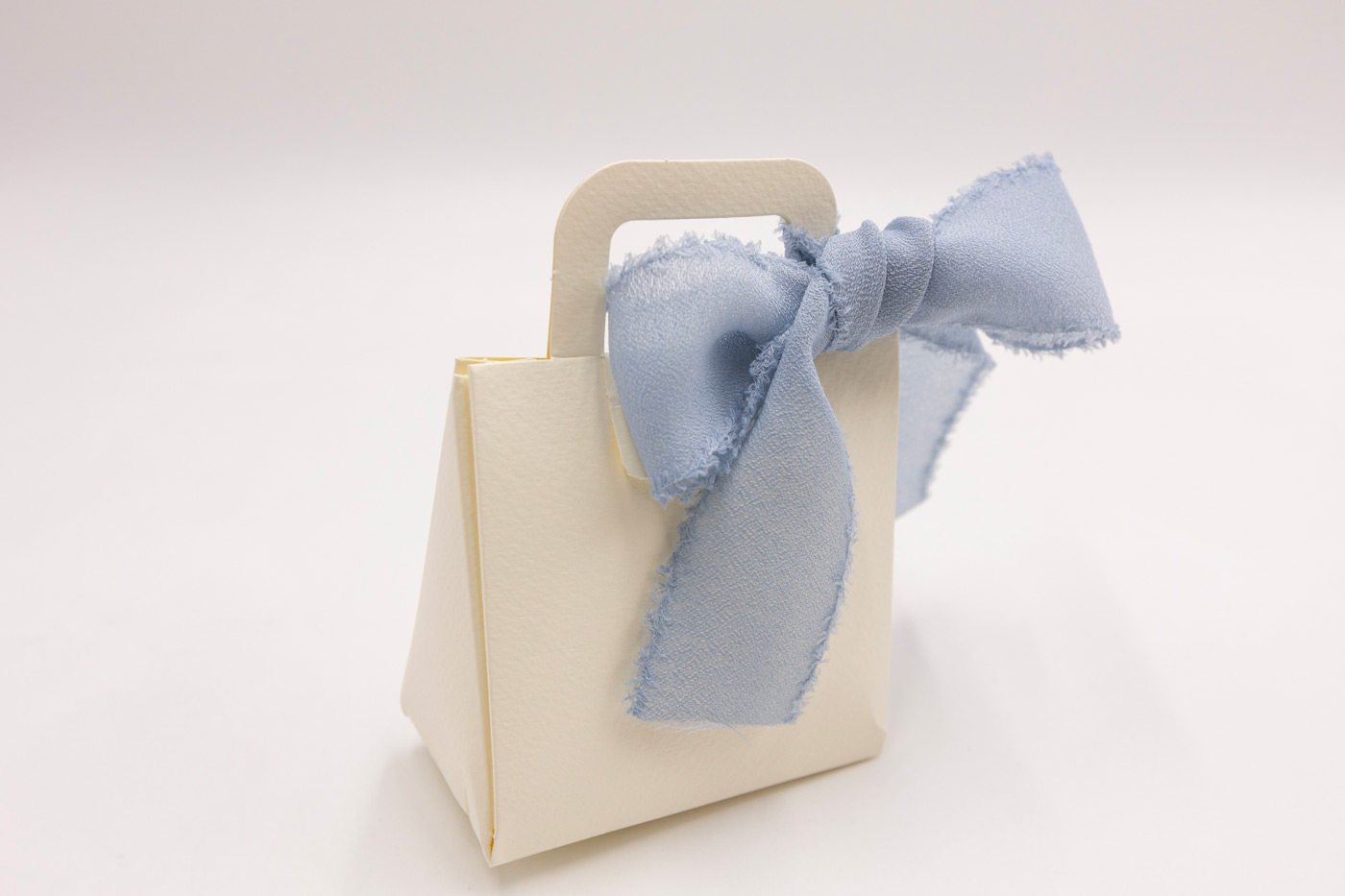 Scatolina borsina su carta bianca martellata e fiocco chiffon colore carta di zucchero