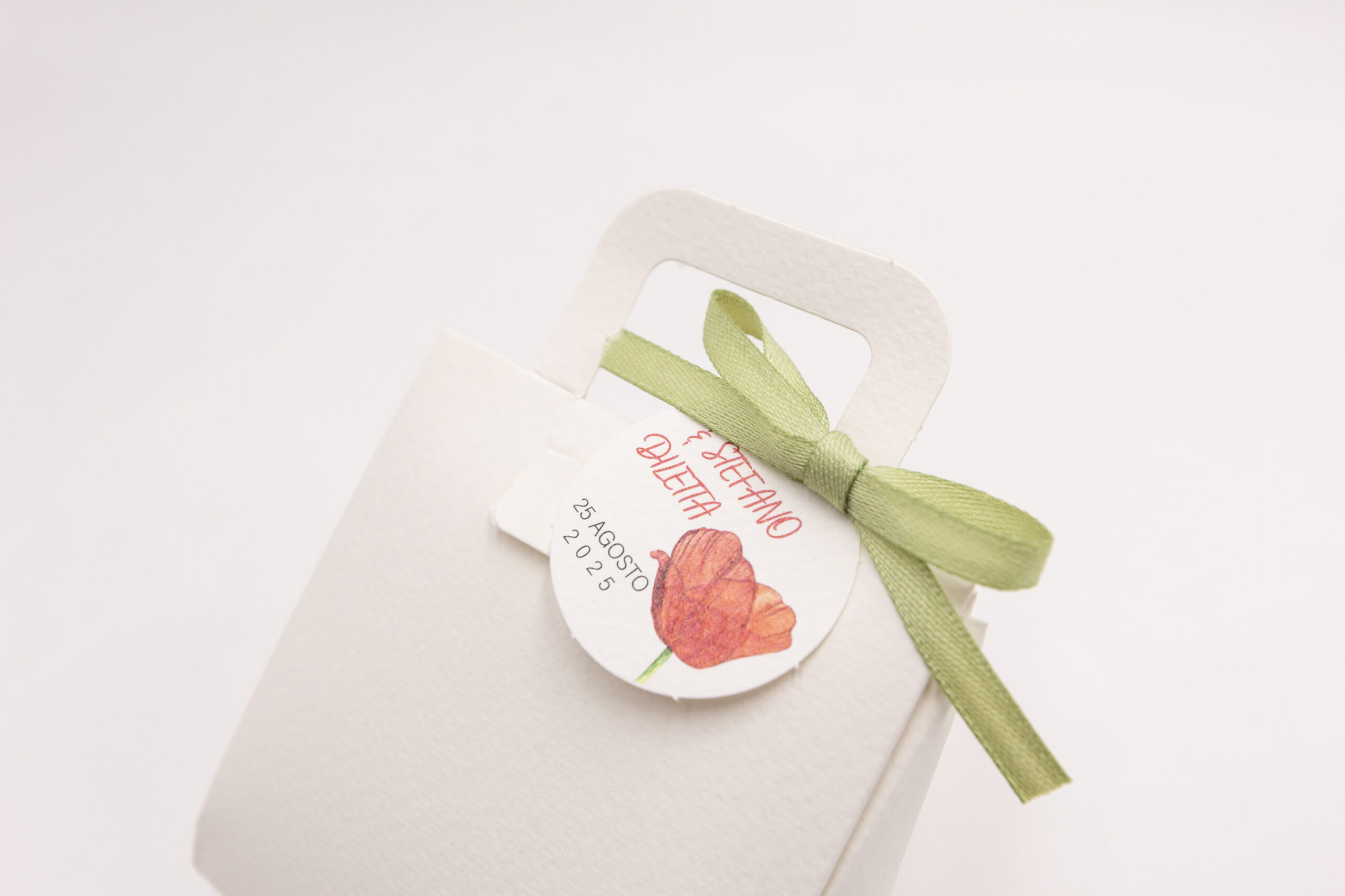 Scatolina borsina su carta bianca martellata, tag stampato 4 colori e fiocco raso color salvia