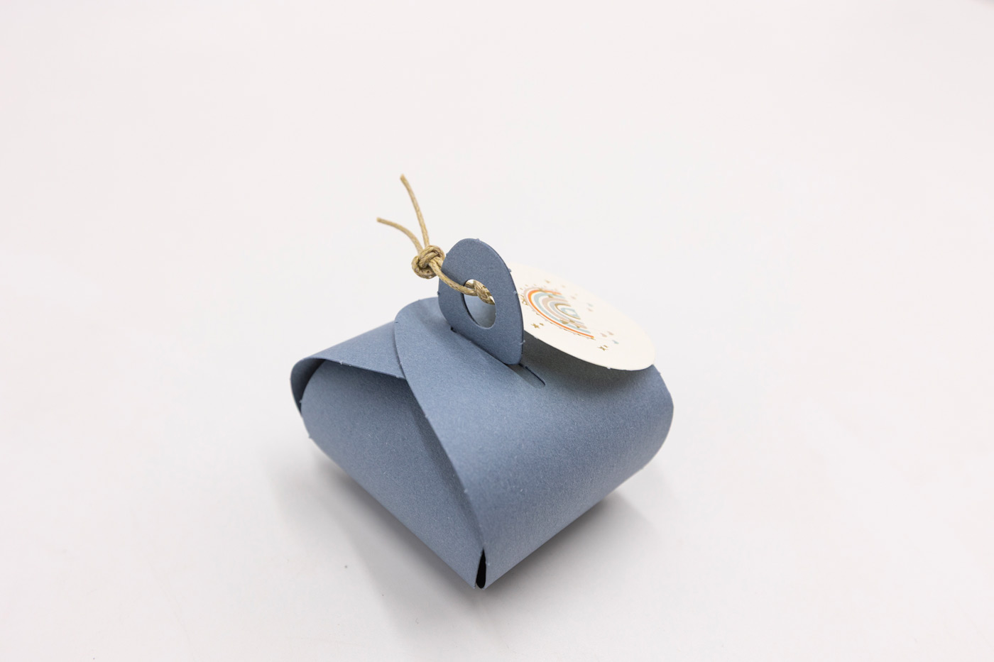 Scatolina a petalo su carta carta da zucchero con tag stampato a 4 colori e corda